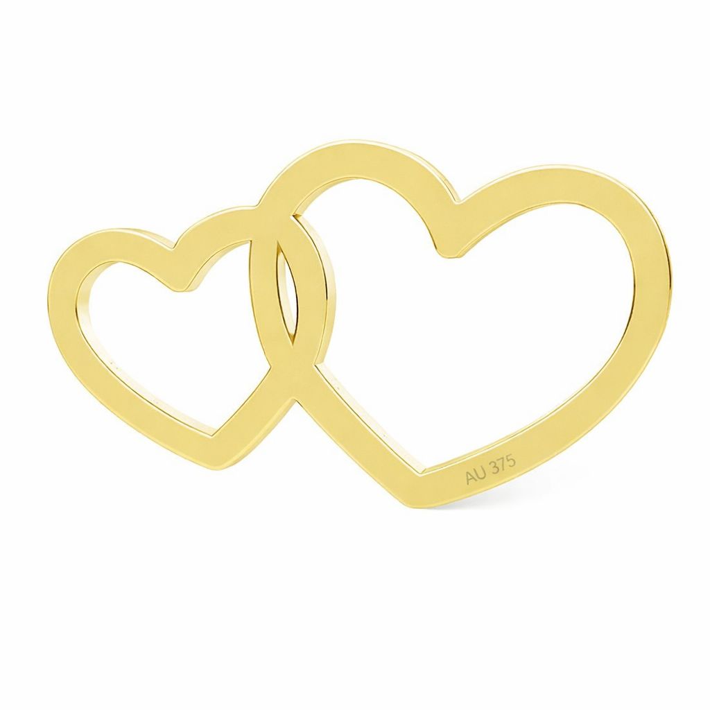 Conectorul în formă de două inimi unite, realizat din aur AU 375, este un semifabricat delicat cu semnificație simbolică. Motivul este potrivit pentru brățări personalizate și coliere fine.