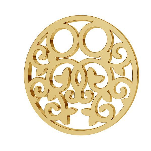 Conectorul ajurat tip „celebrytka” sub formă de plăcuță rotundă din aur AU 375 este un semifabricat minimalist cu formă ușoară și versatilă. Designul clasic este potrivit pentru bijuterii personalizate și moderne.